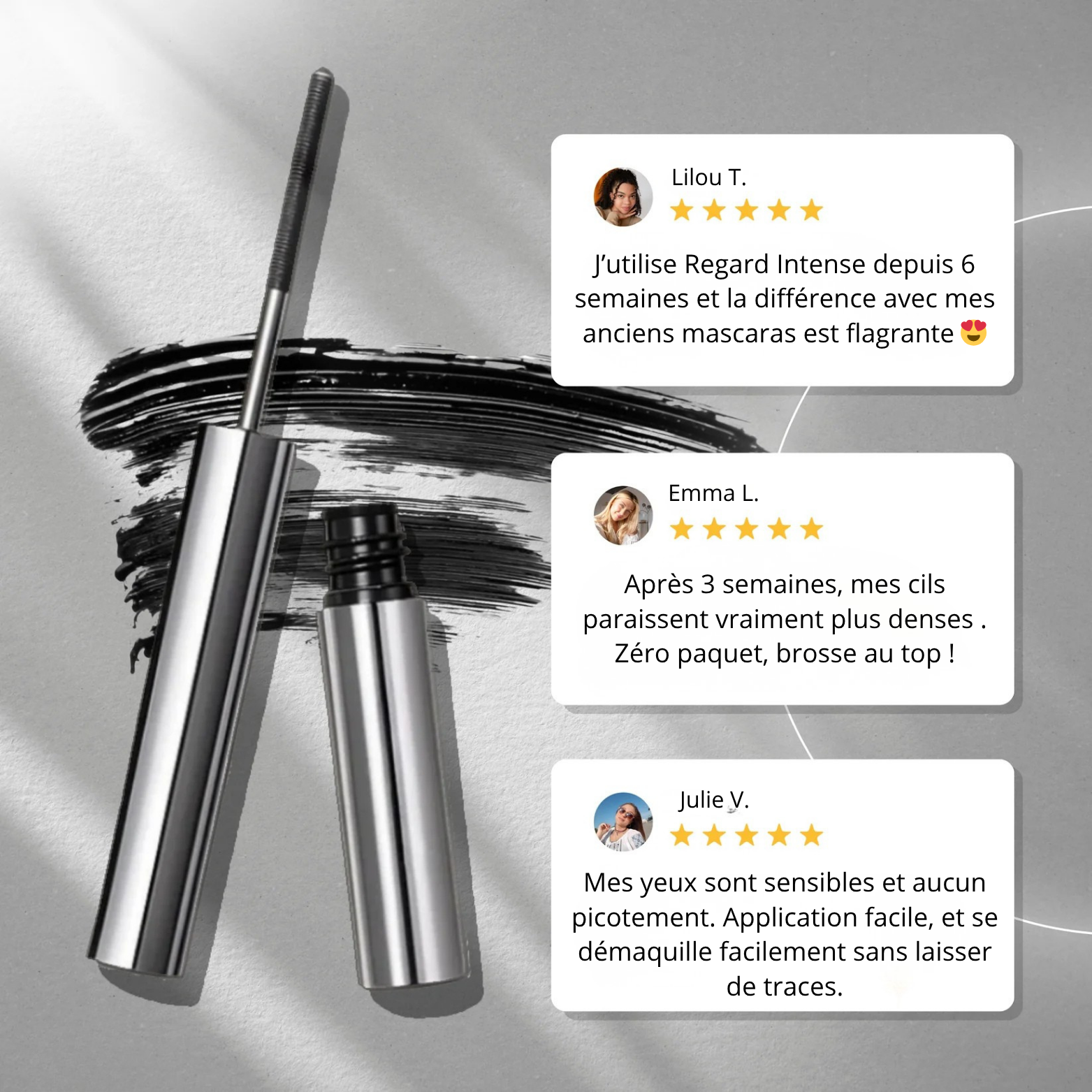 Ilona K.Avis vérifiéJ’utilise Regard Intense™ depuis 6 semaines et la différence avec mes anciens mascaras est flagrante 😍. Avant, j’avais des paquets et des transferts sous les yeux en fin de journée. Ici, la brosse de précision sépare bien chaque cil !